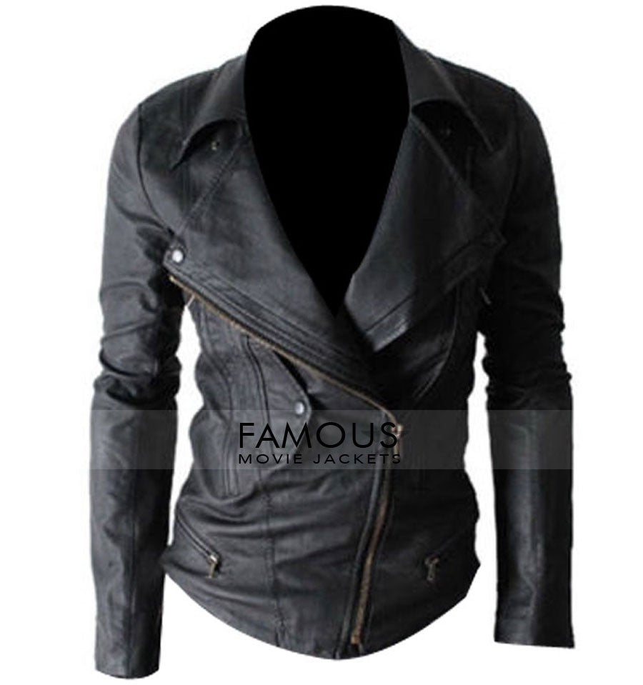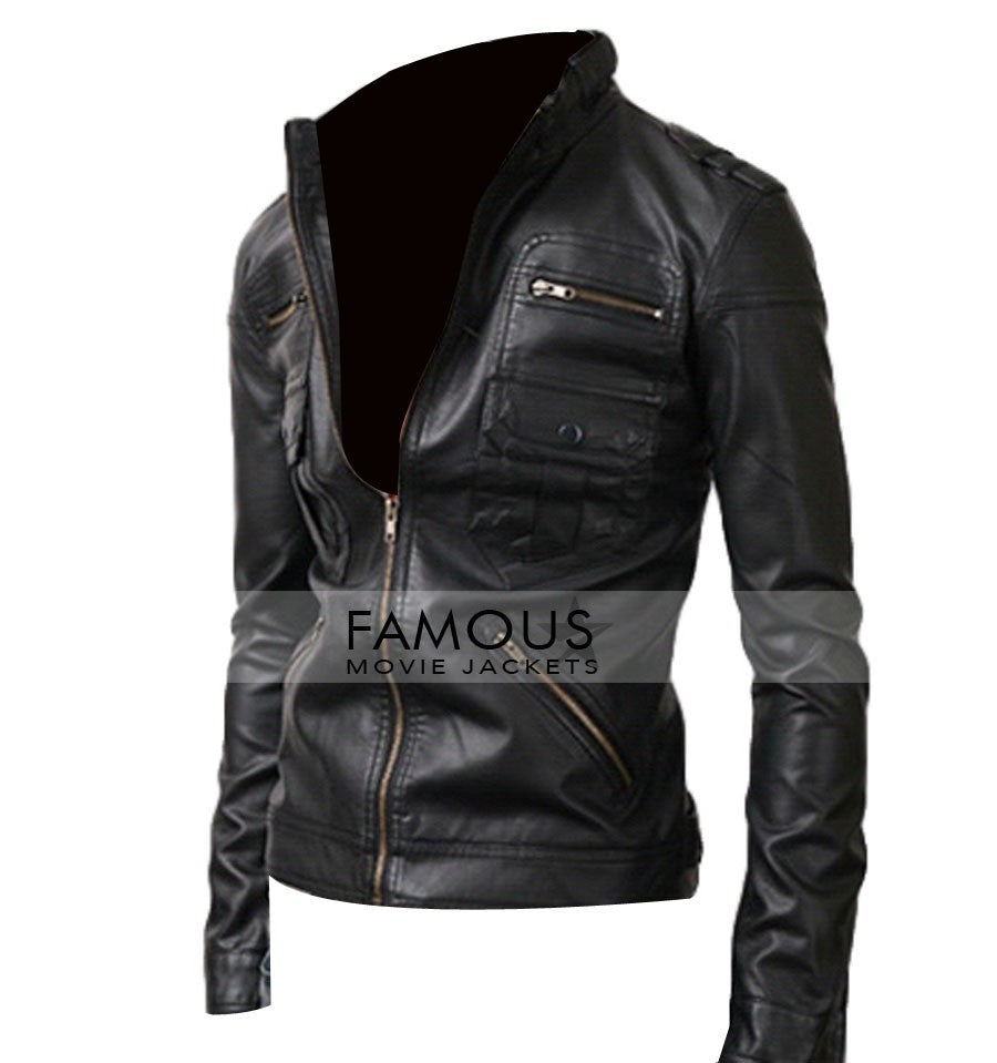 Slim Fit Zip Pocket Black Biker Leather Jacket