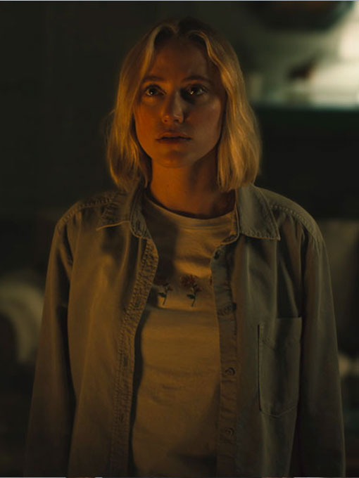 Maika Monroe Watcher 2022 Beige Jacket Observer 2022 Julia Jacket has a captivating and eye-catching...
